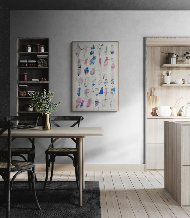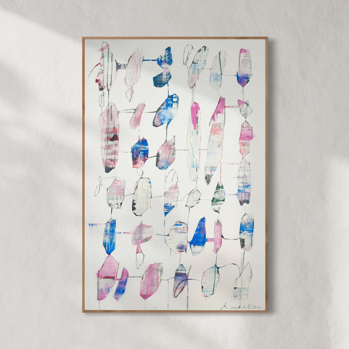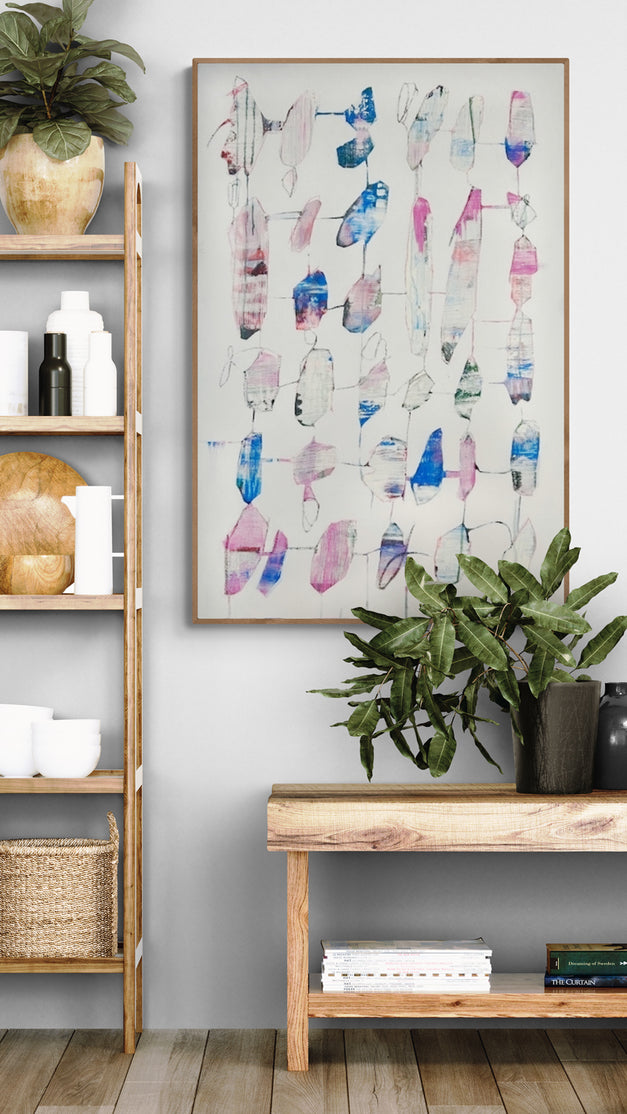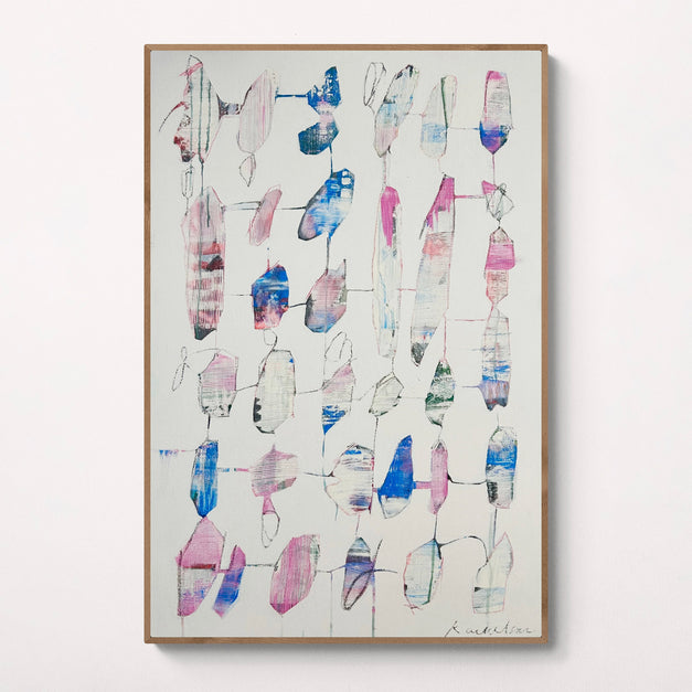 An abstract painting on gallery wrapped canvas framed in a maple wood frame. Ready to hang.