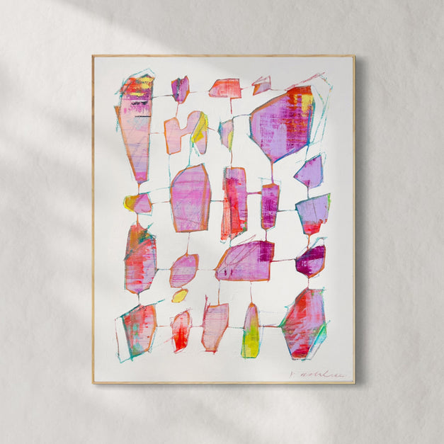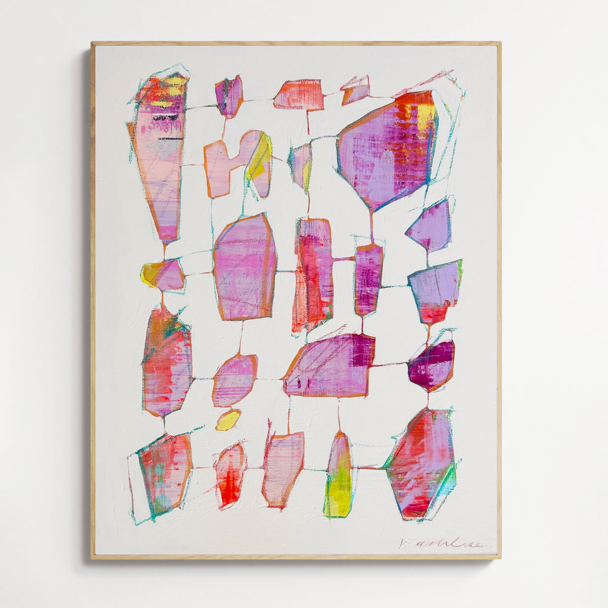 An abstract painting on gallery wrapped canvas framed in a maple wood frame. Ready to hang.