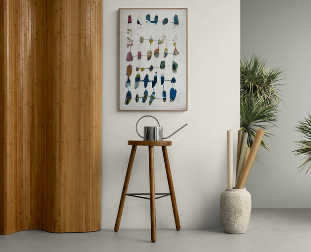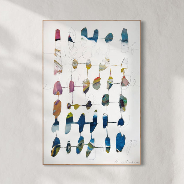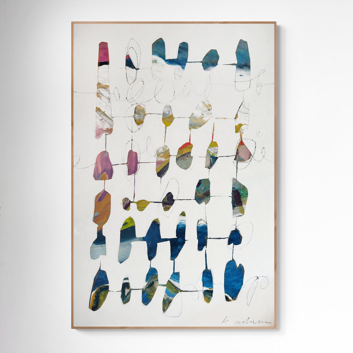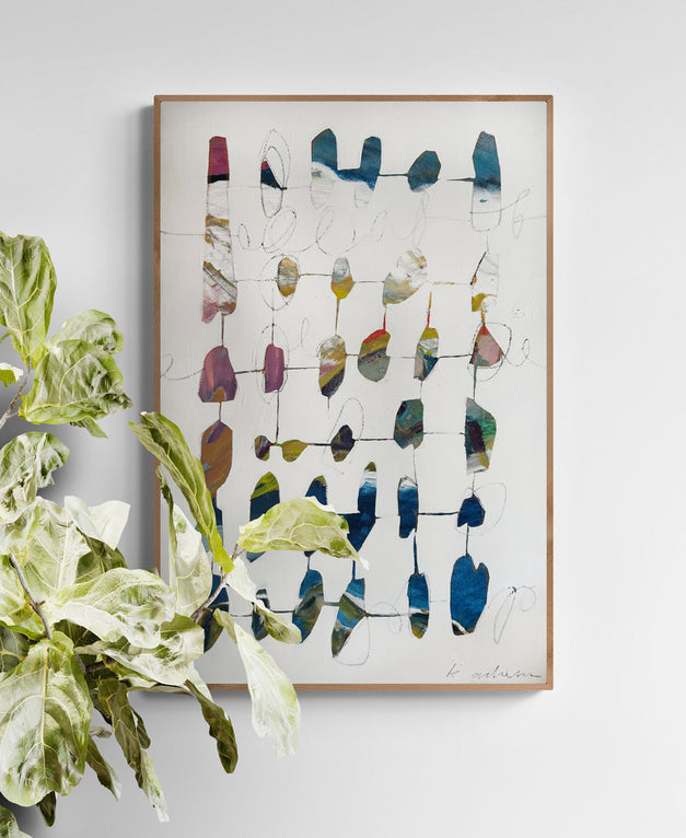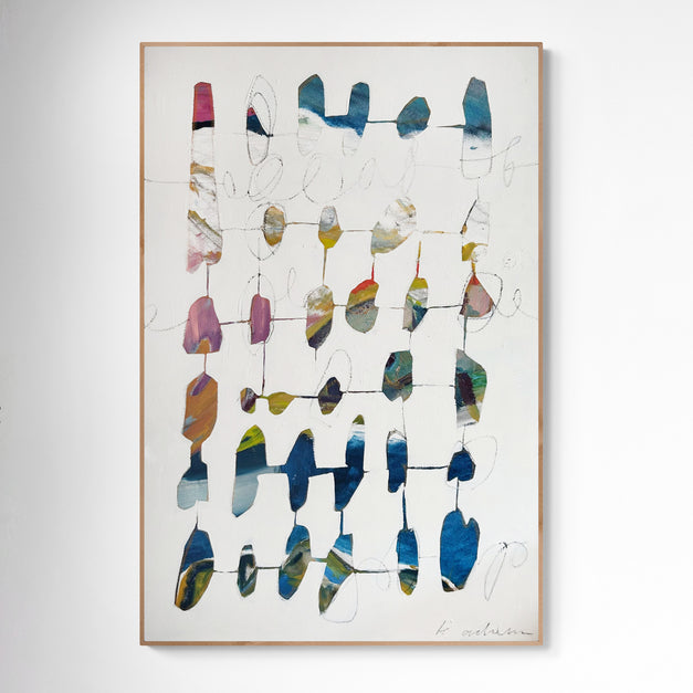 An abstract painting on gallery wrapped canvas framed in a maple wood frame. Ready to hang.