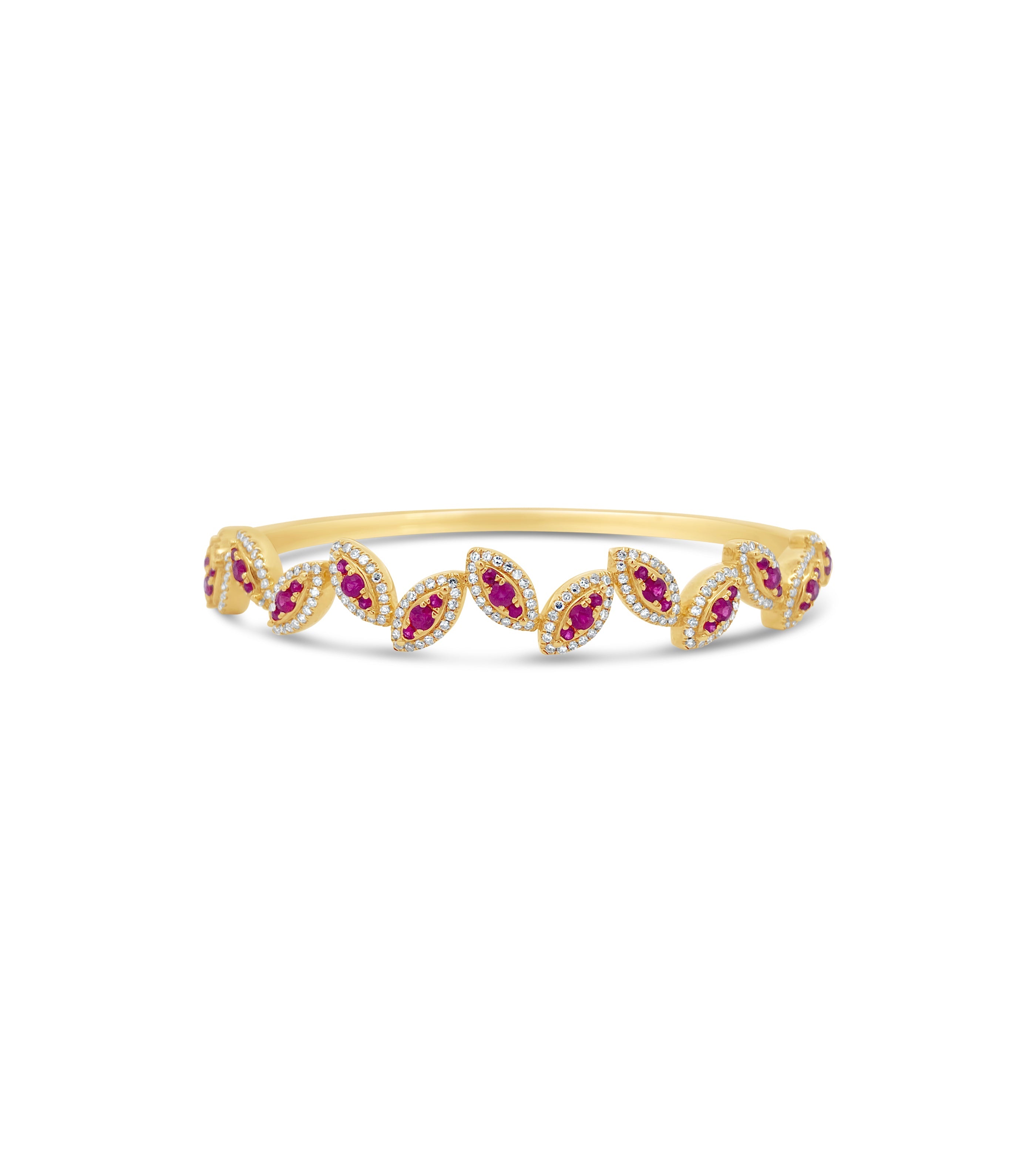 This elegant 14k yellow gold bangle bracelet is accented with beautiful marquise-shaped clustered rubies and diamonds. Its stunning design and craftsmanship make a bold fashion statement, and its timeless design are sure to be a favorite for years to come.