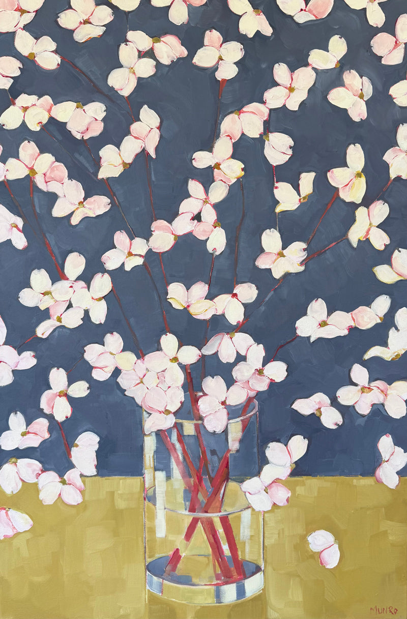 "I focus primarily on movement, color and the texture of the paint in my practice, I’m always looking for new ways to create form. While my work has become increasingly abstract in recent years, the focus on color and pattern as a central component has remained a constant. The same black and white checks that once lined the edges of dishes in a still life now define abstract shapes, creating vertical compositions of tree-like figures. My pallet is unique to my work and acts as a common thread as the subject matter (or lack there of) evolves. The interaction of color, pattern, texture and form creates a harmonious rhythm, keeping the eye constantly moving throughout the composition. I continue expanding my exploration of color and texture, incorporating tissue paper, collage, woodblock prints, and various forms of mixed media in my work. I hope my work conveys a mood, delights the eye, and captures the whimsical nature of life."