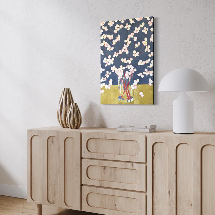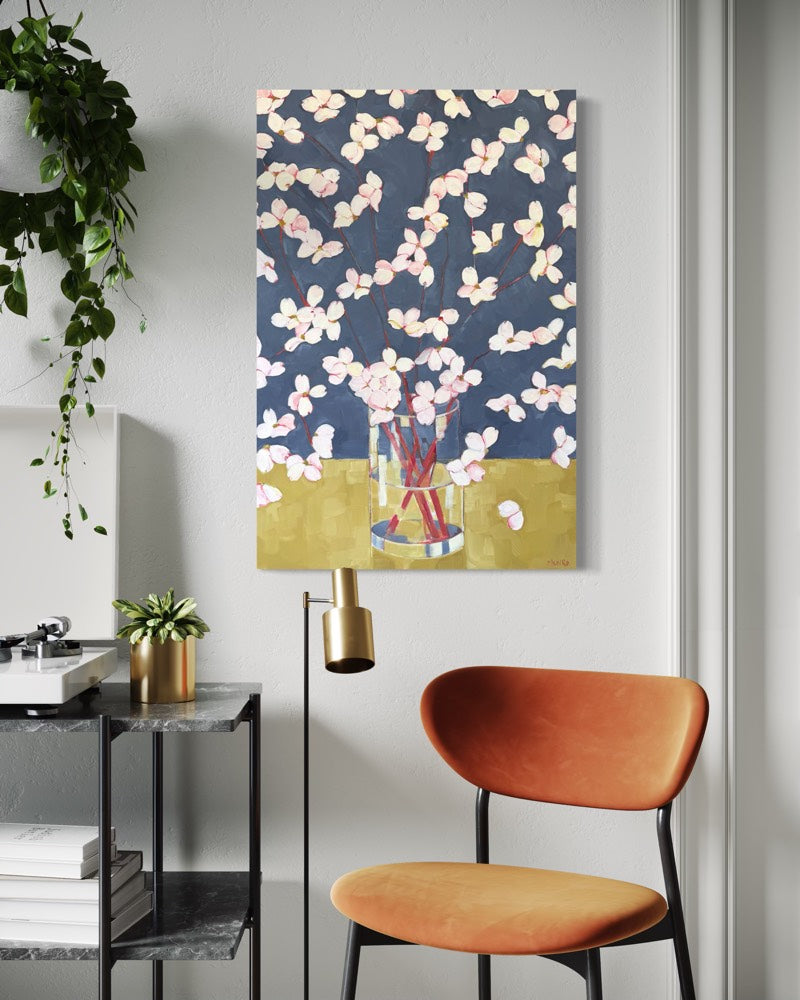 An abstract floral painting on gallery wrapped canvas with art continued painted sides. Ready to hang.