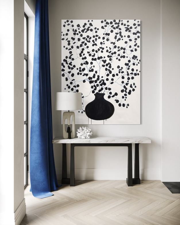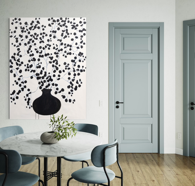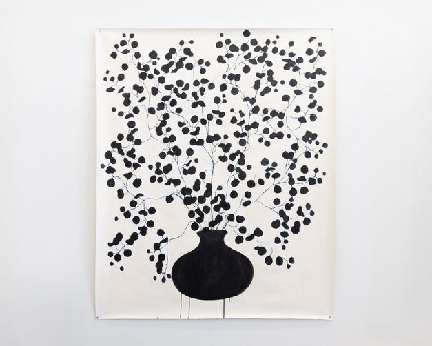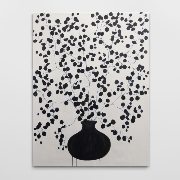 "I focus primarily on movement, color and the texture of the paint in my practice, I’m always looking for new ways to create form. While my work has become increasingly abstract in recent years, the focus on color and pattern as a central component has remained a constant. The same black and white checks that once lined the edges of dishes in a still life now define abstract shapes, creating vertical compositions of tree-like figures. My pallet is unique to my work and acts as a common thread as the subject matter (or lack there of) evolves. The interaction of color, pattern, texture and form creates a harmonious rhythm, keeping the eye constantly moving throughout the composition. I continue expanding my exploration of color and texture, incorporating tissue paper, collage, woodblock prints, and various forms of mixed media in my work. I hope my work conveys a mood, delights the eye, and captures the whimsical nature of life."