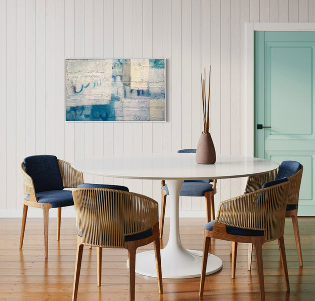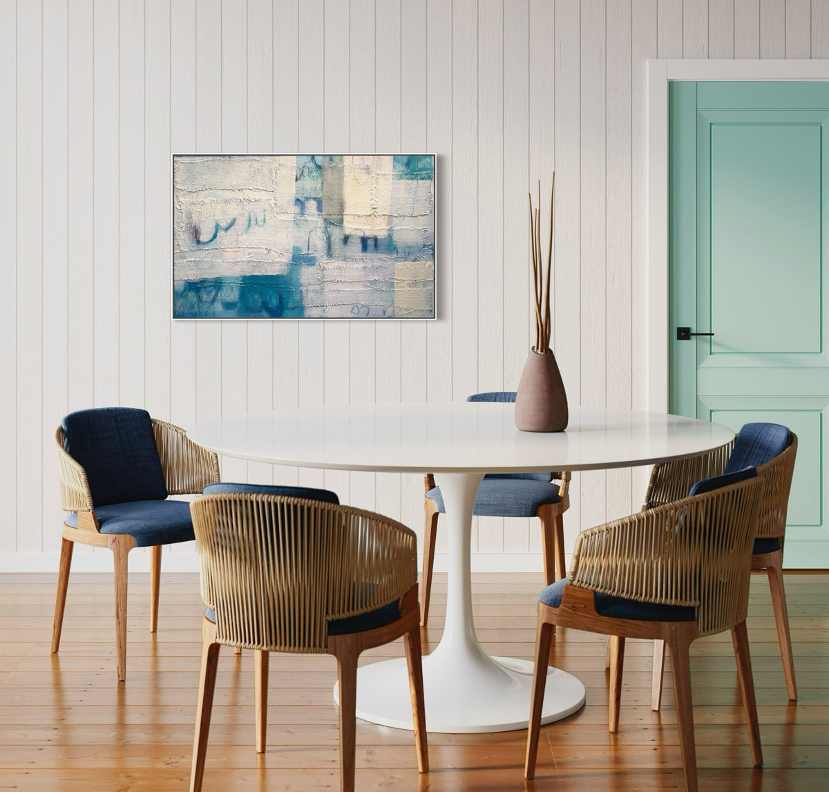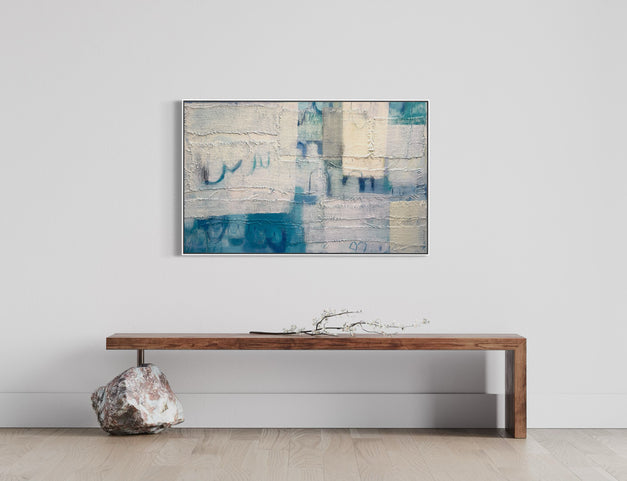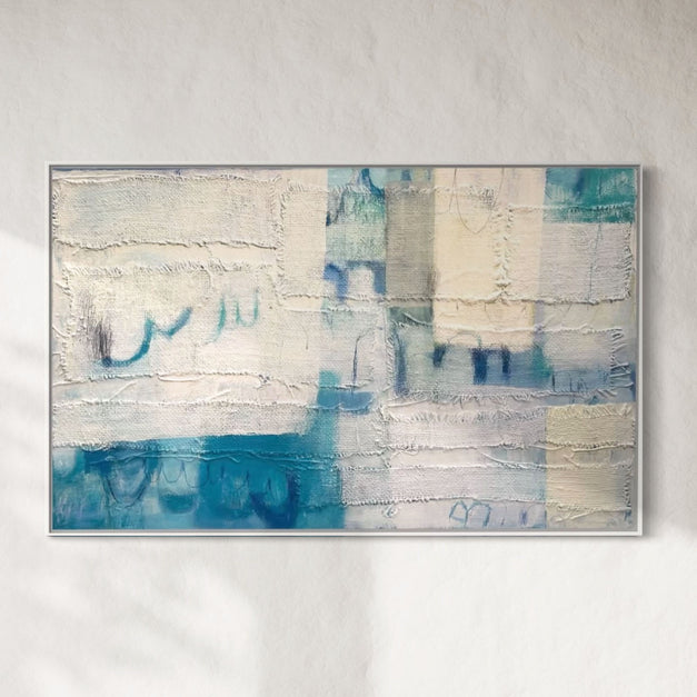 A contemporary abstract mixed media painting on panel in a white wood floater frame. Wired and ready to hang.
