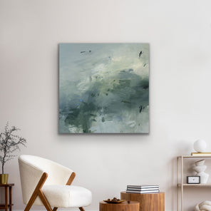 An original abstract painting by Teo Guererra with blue and gray brush strokes hanging on a white wall.