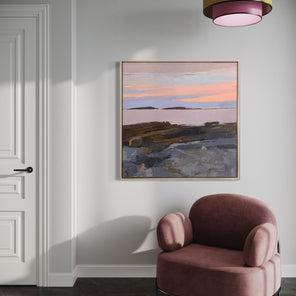 "My practice is rooted in plein air landscape painting, but even when painting directly from life, I consider it painting from memory. In the few seconds between looking from the landscape to the canvas, my brain has taken the light reflected by the world, translated it to electrical impulses, and formed an imperfect short-term memory of that subject. Some artists use measurements and tools to close the gap between memory and reality, but I’m more interested in exploiting it. I use the lapses that occur between observing my subject and marking my canvas as opportunities to invent color and space. I relish the opportunity to lay down a wildly bold pink or exaggerate a slant of light to the point of distortion. By the time a painting is finished, it is more a representation of feeling a landscape than it is a record of seeing one."