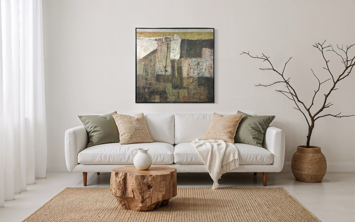 A modern abstract painting on gallery wrapped canvas professionally framed in a silver-hued floater frame. Ready to hang.