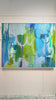 A contemporary abstract painting on canvas in a white wood floater frame. Wired and ready to hang.