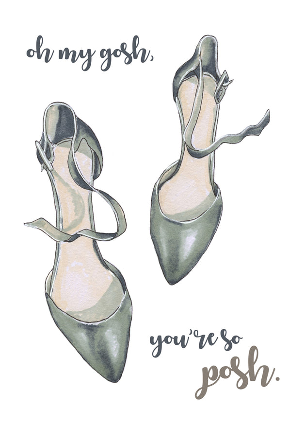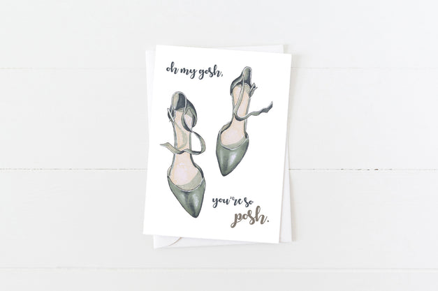 Pack of 5 folded greeting cards featuring a hand-drawn illustration of silver shoes, printed on 110lb matte cover stock. The front of the card reads "Oh my gosh, you're so posh." Blank inside. Envelopes included. Fastened with natural twine.