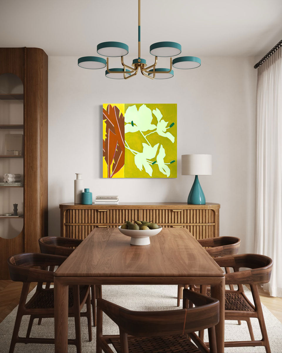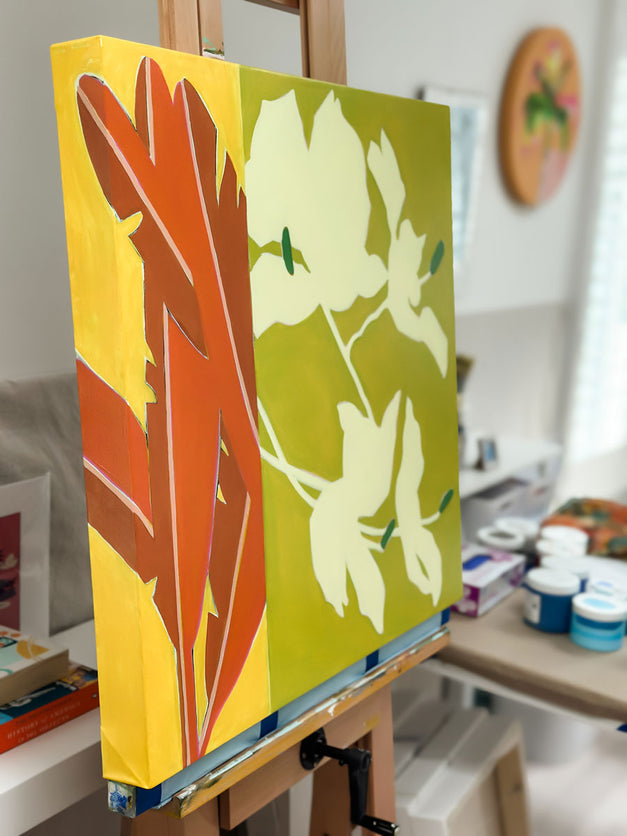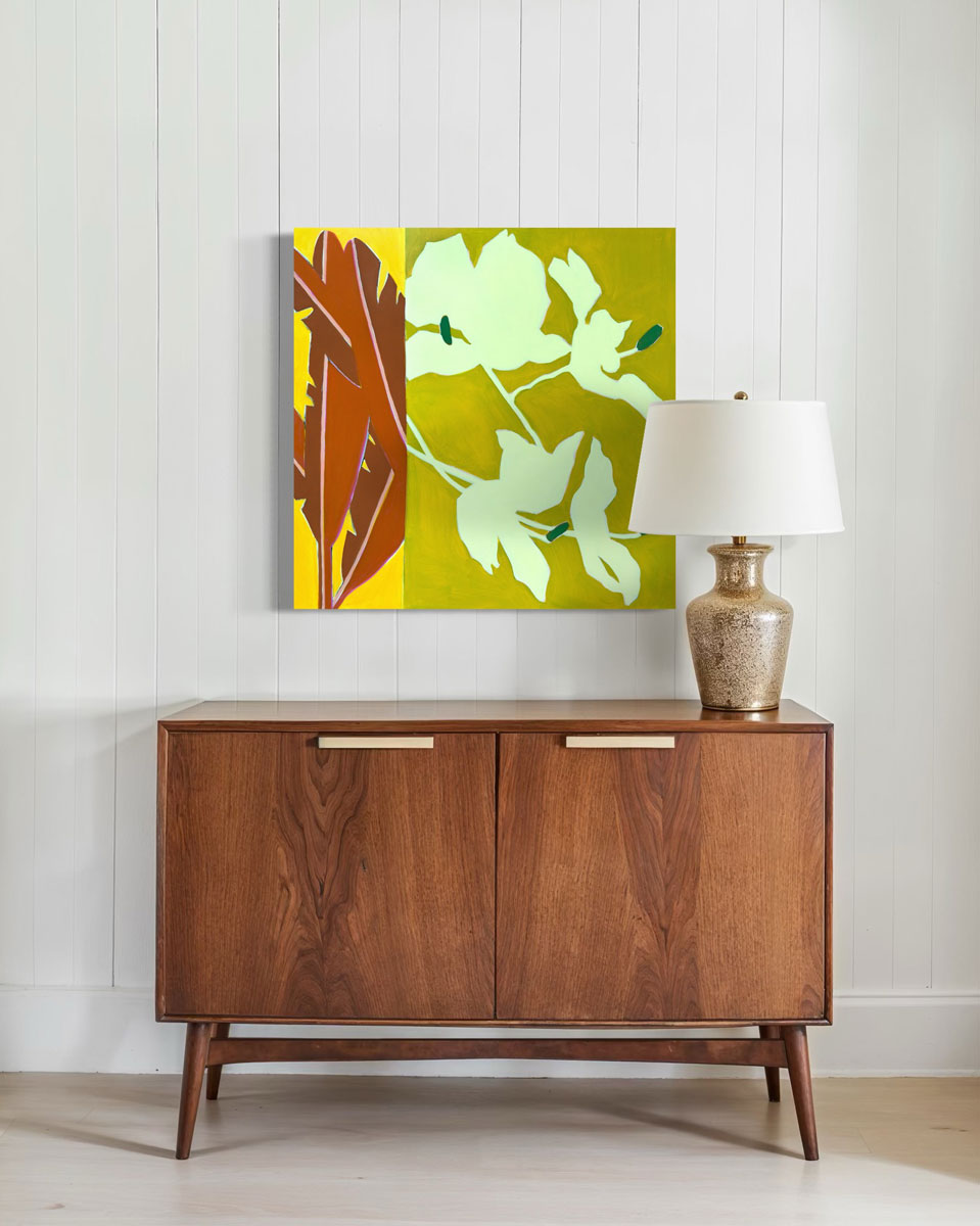 "I enjoy pulling inspiration from my favorite vacation destinations (Palm Springs and Hawaii) and combining it with Mid-Century Modern design for my creative choices; translating the beauty and atmospheric feeling of these places into lively marks, vibrant color, and rhythmic movement.