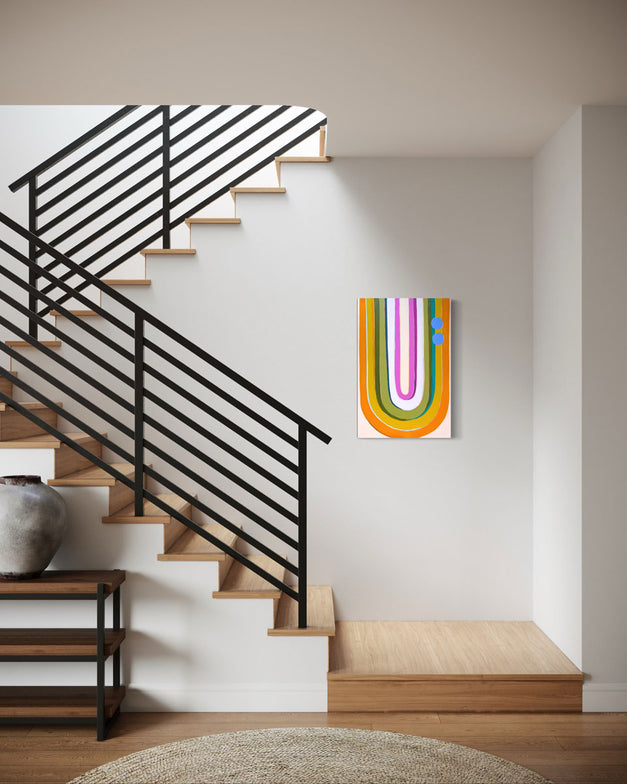 "I enjoy pulling inspiration from my favorite vacation destinations (Palm Springs and Hawaii) and combining it with Mid-Century Modern design for my creative choices; translating the beauty and atmospheric feeling of these places into lively marks, vibrant color, and rhythmic movement.