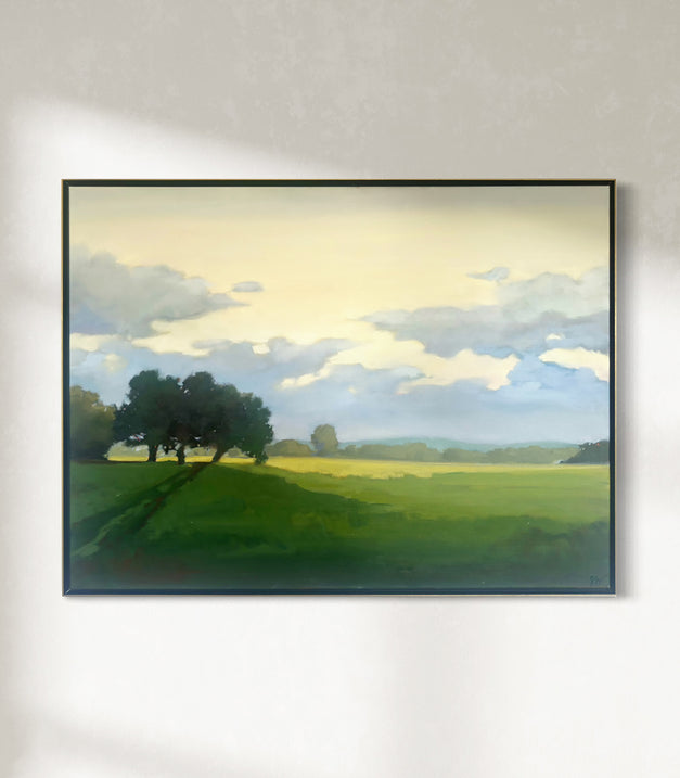 A landscape painting on gallery wrapped canvas in a gold-faced frame with black sides. Wired and ready to hang.