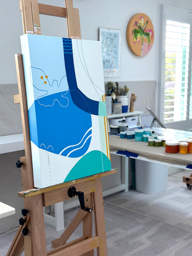 "I enjoy pulling inspiration from my favorite vacation destinations (Palm Springs and Hawaii) and combining it with Mid-Century Modern design for my creative choices; translating the beauty and atmospheric feeling of these places into lively marks, vibrant color, and rhythmic movement.