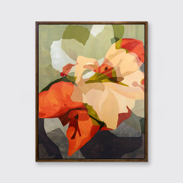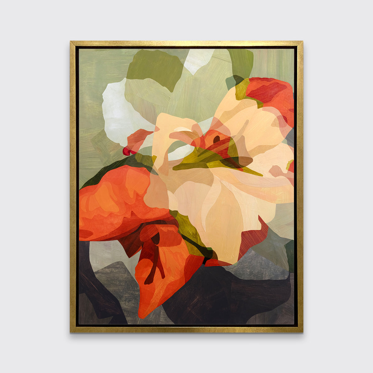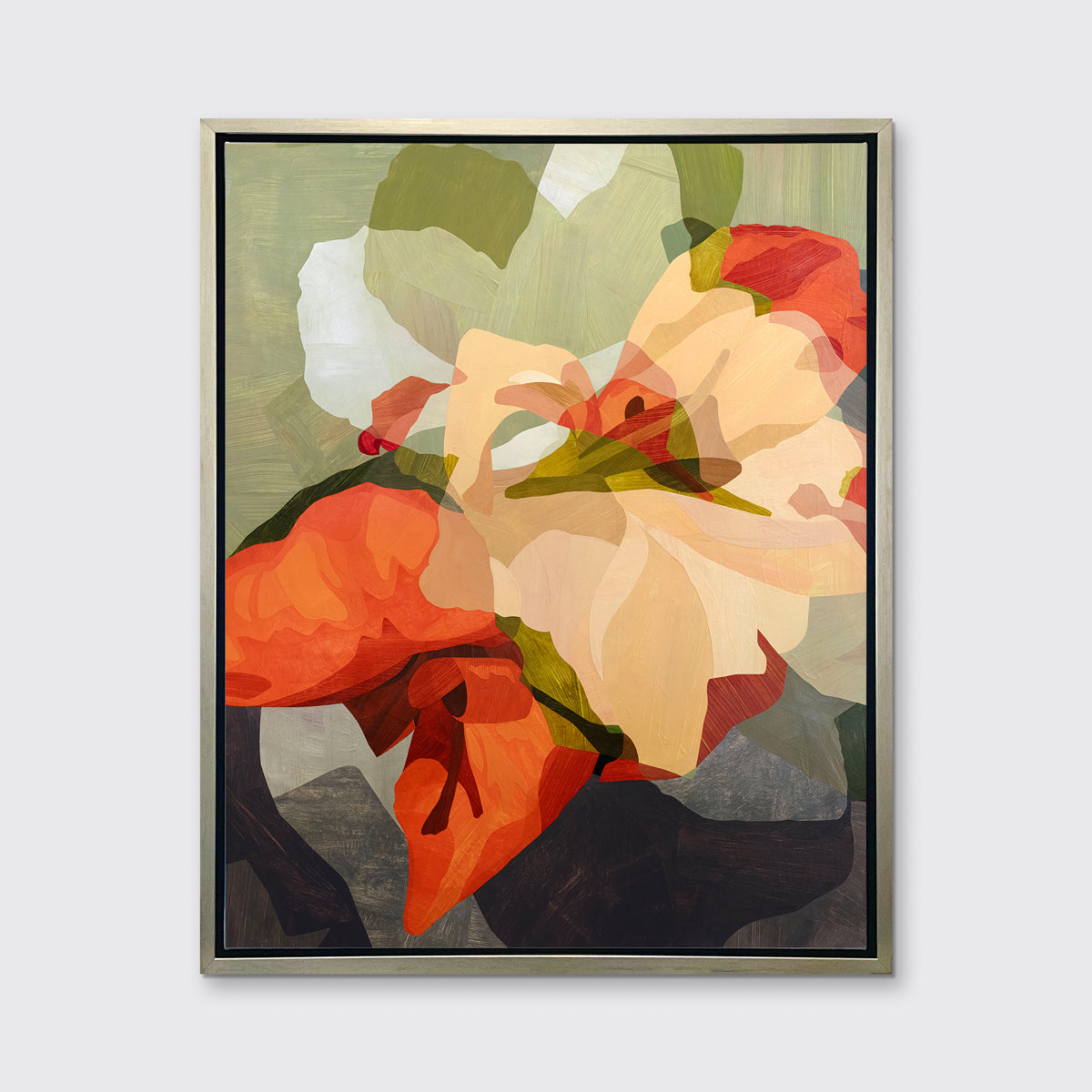 "I collage with swatches of paper that are covered with loosely painted brush strokes. The washy paint in contrast with the sharp edges of my designs references my work as a digital illustrator working with vector shapes. Silhouettes also play an important role in my compositions. They allow me to repeat my subjects, emphasizing their importance. Plants appear at different stages of life in my work as a metaphor for personal growth and maturation, intergenerational influence and tradition. These blooms were nourished by the people in my history. They also help me reckon with the natural process of my own aging.