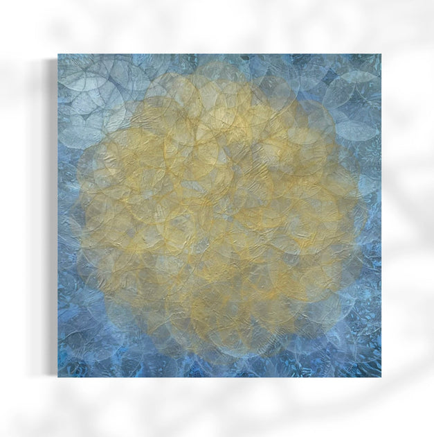 “I have never known any other path to take except that of an artist," Mudre says. "The concept of infinity has been the inspiration for my work, employing the circle, the perfect form, as a muse. These mages reference microscopic worlds, cellular growth, auras, the cosmos, and places unseen, only imagined. The square format allows for a field of pattern that continues equally in all directions, reinforcing the feeling of infinity. My paintings begin with the application of metallic leaf. Using both additive and subtractive techniques, multiple layers of glazed color are built up. The underlying metallic leaf not only adds a rich tone to the work, it allows the light to refract off the surface of the finished painting. A variety of tools are used including brushes, scrapers and rags giving the paintings a very nuanced texture and complex depth of color. The combination of reflective metal leaf and the many layers of glazed color allow the painting to appear subtly different, depending on the light and viewing angle, creating a constantly changing visual experience. The result is a record of a journey that is both a sensuous and a creative exploration."