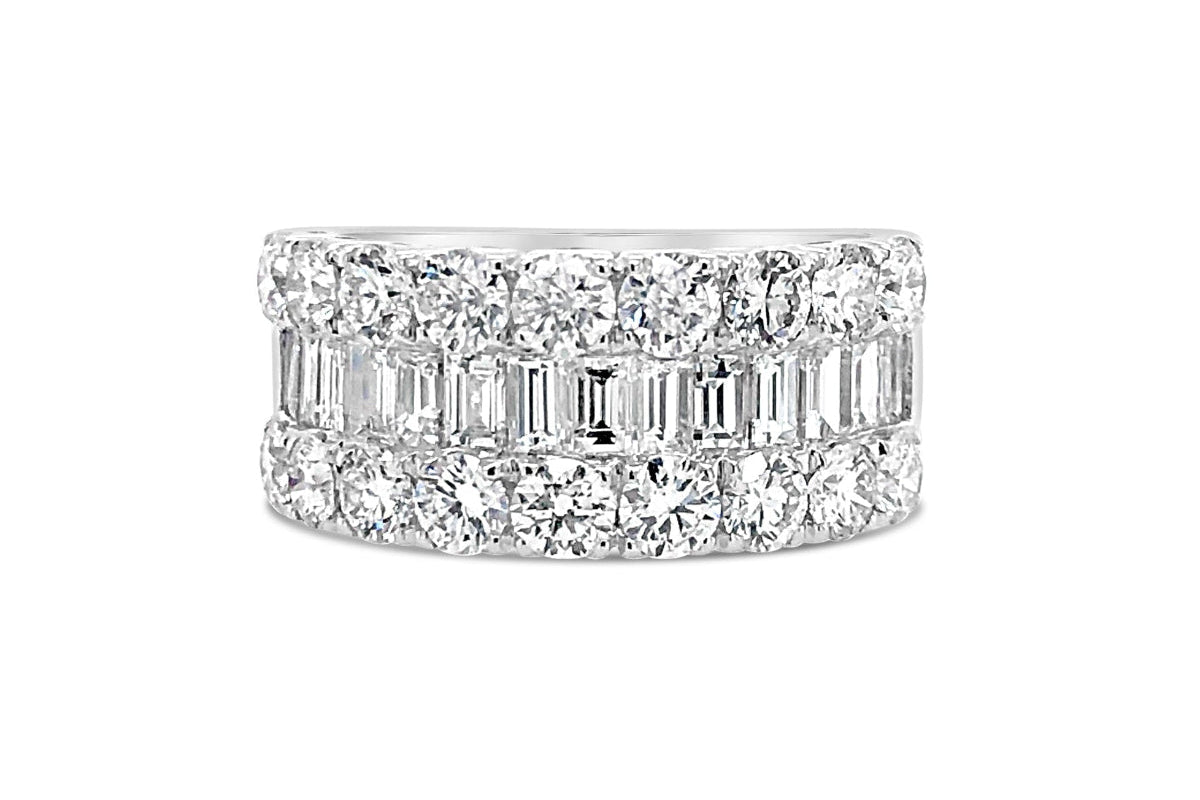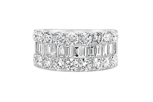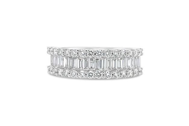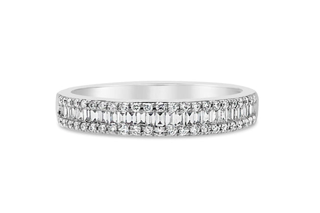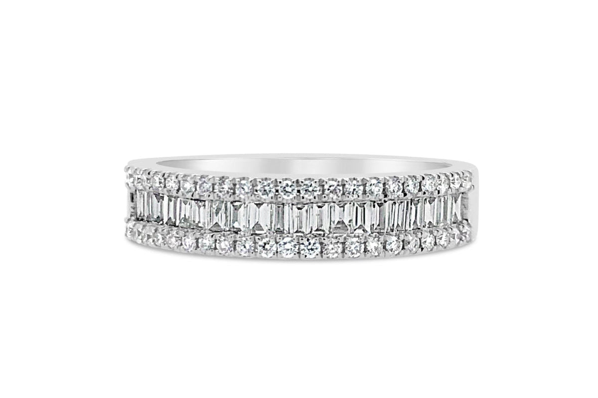 Sparkle and shine with our Baguette & Round Diamond Band. Made from solid 18k gold, this beautiful wedding band features a stunning combination of baguette and round diamonds. Add a touch of elegance and sophistication to your special day with this luxurious piece.
