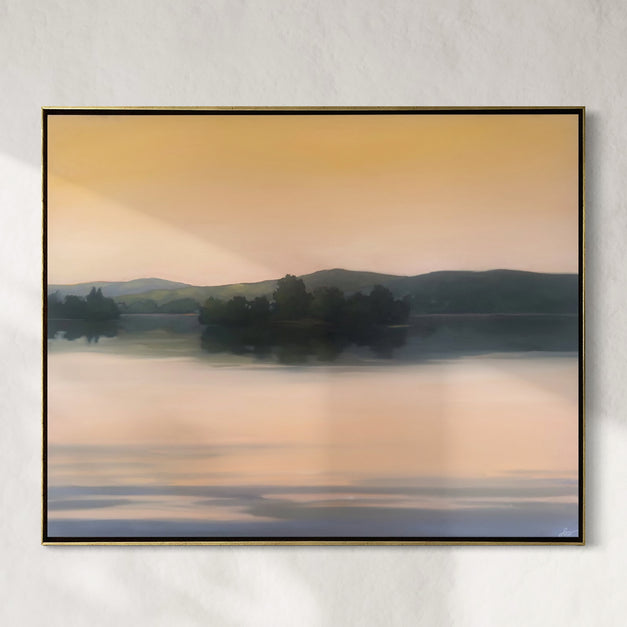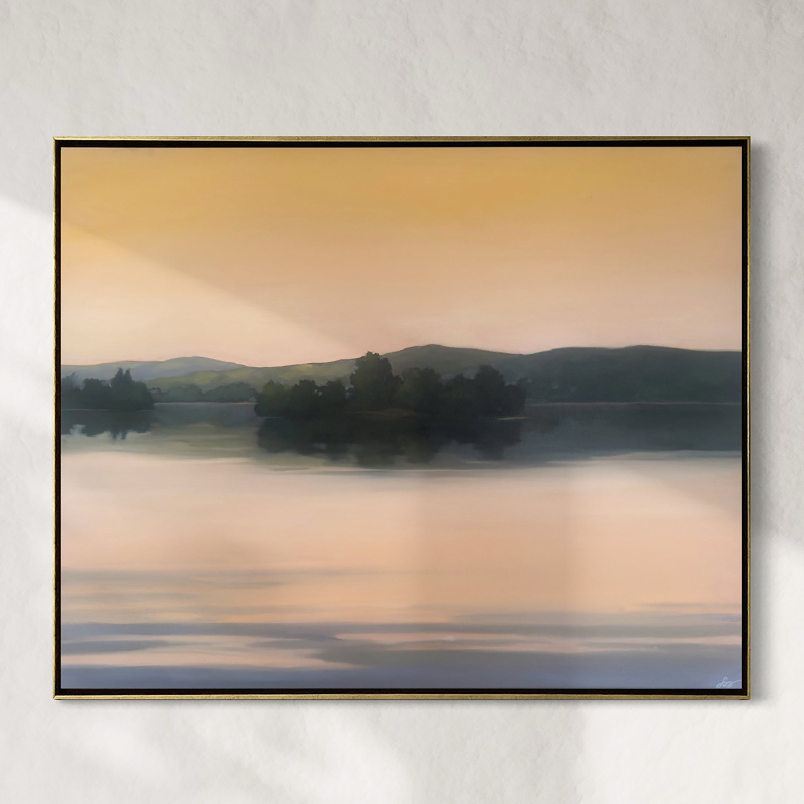 A landscape painting on gallery wrapped canvas, framed in a thin floating frame with gold face and dark sides. Ready to hang.