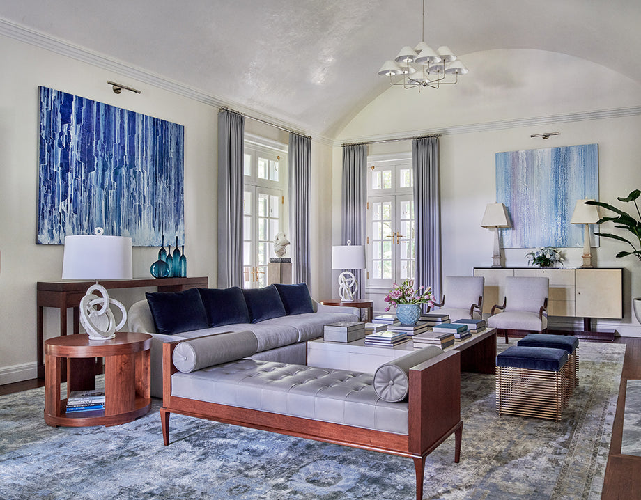 This light, modern sitting room in a Connecticut home was designed by Chris Roughan of Roughan Interiors. Statement paintings by Sorelle artist, Teodora Guererra, finish the space with tranquil colors and misty texture.