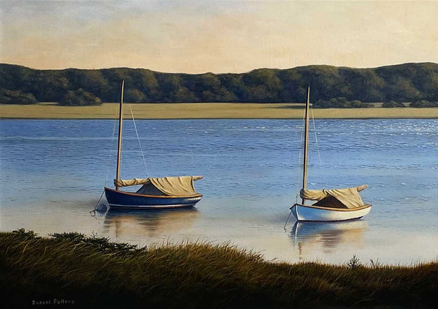 For almost 15 years, Daniel took a sabbatical from painting, but this didn’t affect his love for the sea. He obtained a Captain’s License in 1977 from the United States Coast Guard and took passengers for hire on the open ocean. Through this experience and visual knowledge he was drawn to begin painting again. Although Daniel was primarily self-taught, he worked with Frances Norris Streit, a portrait and mural artist, assisting her on a 14’ x 30’ historical mural for the Roslyn Savings Bank. He also studied with Everett Molinari, a well-respected President of the National Mural Society. Museum collections include Long Island Museum, Parrish Art Museum, and Guild Hall Museum.