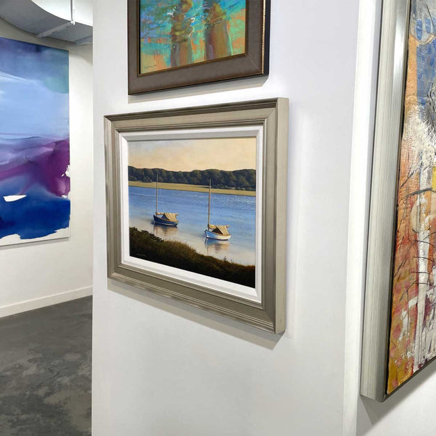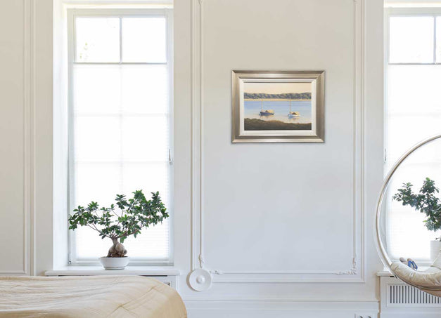 16" x 20" (20" x 26" framed).  Mounted on board and framed in a linen-lined, warm silver frame. Ready to hang.