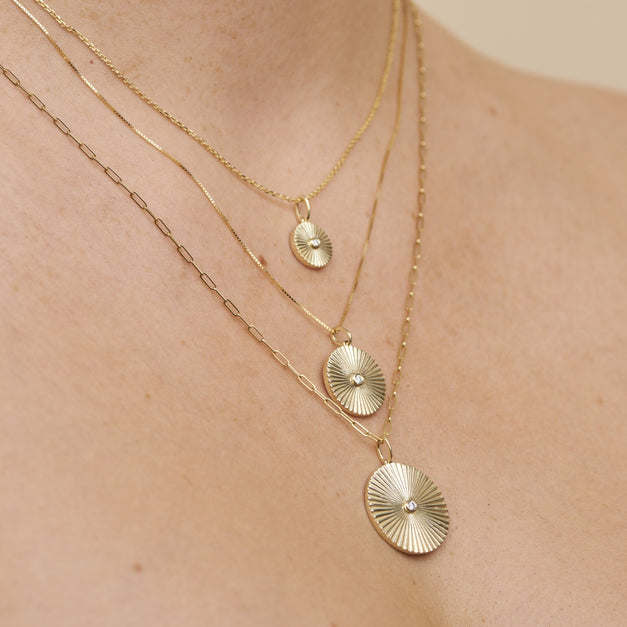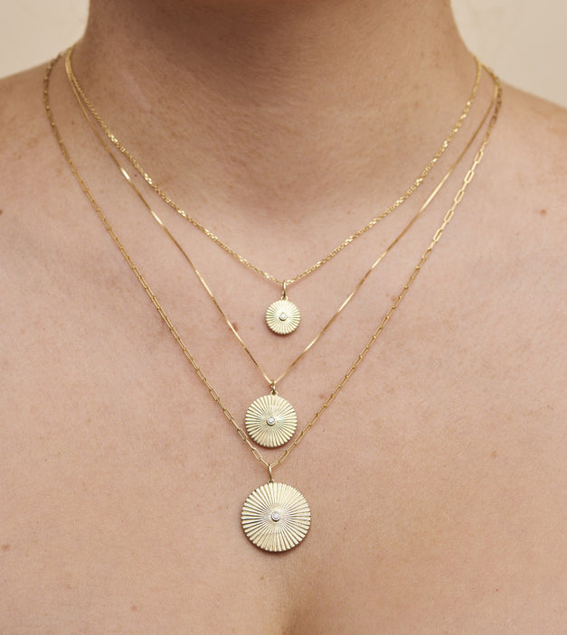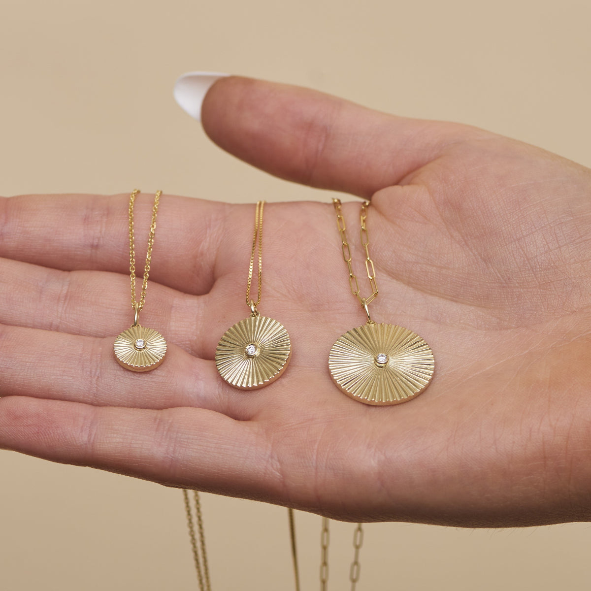 Adorn your neck in style with this beautiful Diamond Fluted Medallion Necklace. Crafted in solid 14k gold, it features a bezel diamond. The fluted ray necklace is an modern touch to the classic disc charm pendant that will shine with every move you make. Perfect for adding a touch of luxury to your look!